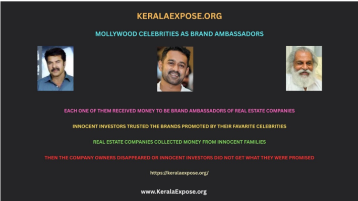 The primary mechanism used to lure thousands of families, often non-resident Keralites (NRKs) or middle-class investors, by the real estate developers and builders to invest in a real estate project begins with glittering marketing, colourful brochures promising paradise in God's Own Country and using celebrities to deliberately manufacture trust. Real estate developers who operate with impunity have routinely employed the biggest faces in Malayalam cinema and music - including icons like Mammootty, Yesudas, and Asif Ali - as their brand ambassadors. These glittering endorsements serve as a psychological inducement, transforming risky, under-regulated investments into seemingly secure assets backed by the credibility of Kerala’s most respected celebrities. This strategy has proven devastatingly effective, allowing unscrupulous builders to collect massive sums of hard-earned money, often their life savings, for projects that were either non-compliant, located on illegally converted land, or simply never completed. And then the real estate developer disappears leaving not even a contact for the innocent investor to follow up for return of their money or delivery of the promised land, apartment, villa, or commercial space.