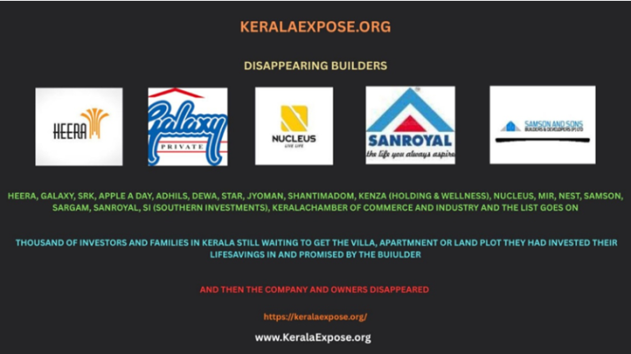 Builders who have cheated their customers and have mostly disappeared include Heera, Galaxy, SRK, Apple A Day, Adhils, Dewa, Star Homes, Jyoman, Shantimadom, Kenza, Nucleus, MIR, NEST, Samson, Sargam, Sanroyal, Si (Southern Investments), Kerala Chamber of Commerce & Industry and the list goes on… with thousands of investors and families in Kerala still waiting to get the villa, apartment or land plot they had invested in and promised by the builder. (A simple Google Search of the internet will highlight all the above names. Hence, we are not listing the links here individually to the case judgements, media reports, police complaints etc. about the above companies). Thousands of innocent investors who invested their hard-earned life savings with these builders and many others demonstrate that the core promise of the Kerala real estate sector is, for thousands of families, a calculated, broken contract built on fraud, deception, and cheating.