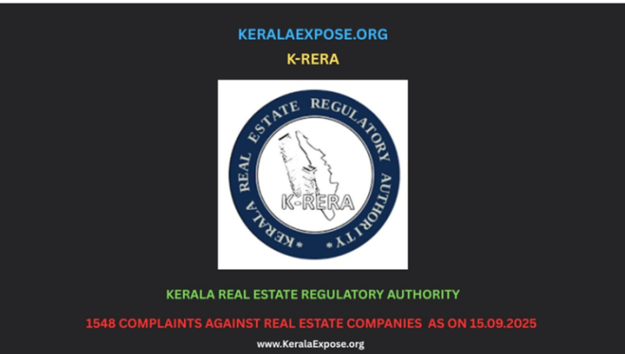 Kerala RERA (K-RERA) website lists 1548 complaints against Real Estate Companies, Builders and Developers in Kerala as on 15.09.2025 (https://krera-audit.xocortx.com/complaint-list). Consumer Disputes Redressal Commission complaints against Real Estate Developers in the District, State and National levels are separate from the RERA complaints as also civil cases and criminal cases against Real Estate Companies, Builders and Developers in Kerala.