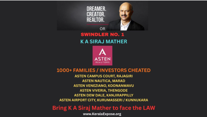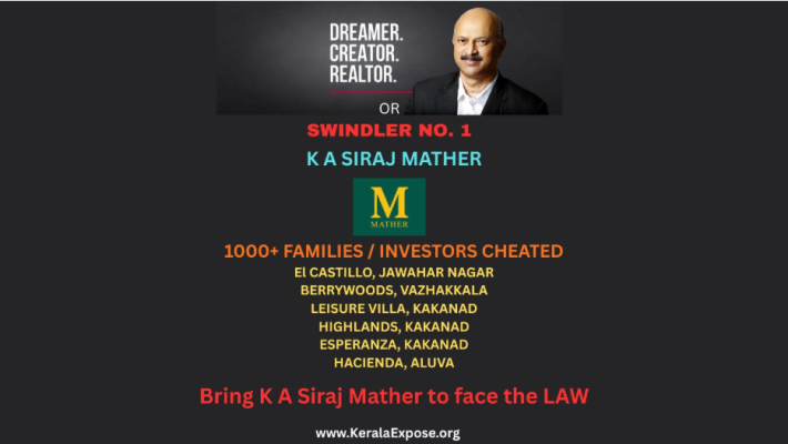 In this launch expose series, KeralaExpose.org Investigative Report 1, Chapter – 2, we, KeralaExpose.org, brings to the fore, after a detailed and deep investigation over the last 9 months, the report (story) of a silent and slick real estate operator in Kerala, K A Siraj Mather, hailing from two very socially and financially prominent families (paternal and maternal) in Kerala, who has cheated Rs. 2000.00 crores+ from over 2000 investors and families in real estate projects (land, apartments, villas, timeshare, warehouses, and resorts) and has stayed under the radar of media and the long arms of the law and authorities till date successfully.