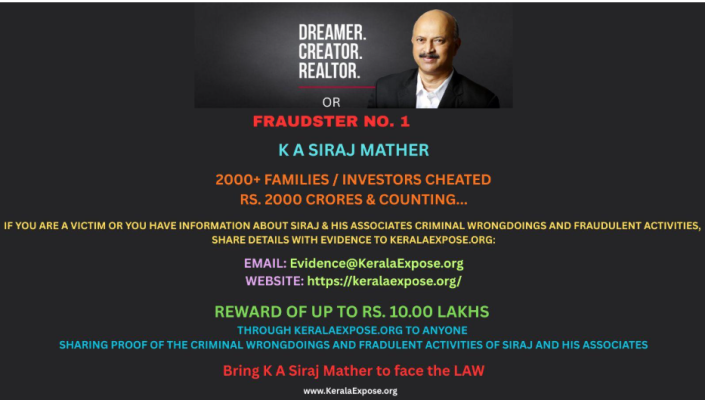 In the interest of getting justice for all the victims cheated by Siraj, a set of investors cheated by Siraj and his associates are offering a REWARD of up to Rs. 10.00 Lakhs through KeralaExpose.org to anyone sharing proof of the criminal wrongdoings and fraudulent activities of Siraj and his Associates which results in the criminal conviction of Siraj and his associates under the applicable criminal laws including BNS (previously IPC), PMLA, Income Tax Act, SFIO Act, FEMA, Benami Property Act, Black Money Act etc. in India and applicable laws in Dubai & UAE. While you submit the evidence, please mention if your name and contact details are to be kept confidential so that we ensure your confidentiality if you require the same.
