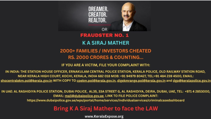 We, KeralaExpose.org, are requesting all victims (individuals, families and legal entities) who may have been cheated by Siraj and / or have been victims of the fraudulent activities of Siraj and / or those individuals who may have knowledge, with proof, of the criminal wrongdoings of Siraj, his associates, his benamis and his staff in India and UAE to share details of the cheating / criminal wrongdoings / fraudulent activities engaged in by Siraj and his Associates to the email – Evidence@KeralaExpose.org - so that we can take the same up with the concerned authorities and our clients and you can get justice to prevail in all such criminal wrongdoings engaged in by Siraj against you. Or you can upload the documents on our website at https://keralaexpose.org/.