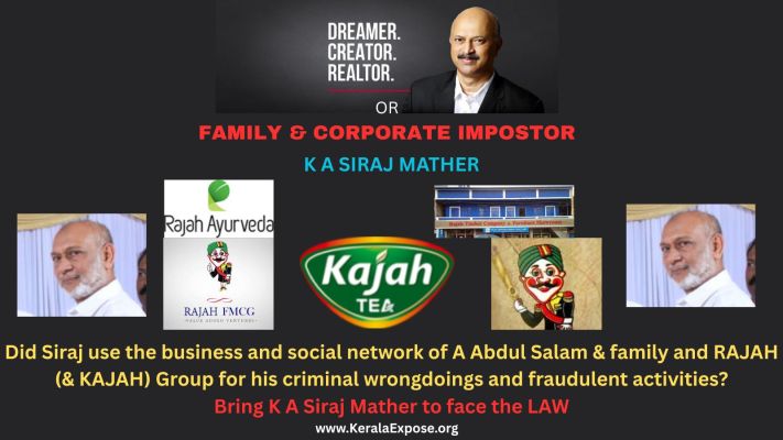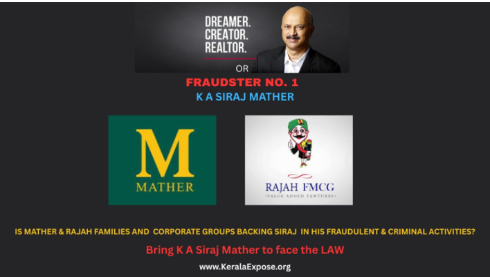 Our investigation reveals that this very asset – trust and reputation – of these two families and corporate groups was identified, calculated, and coldly liquidated by one "black sheep" member from both families - K.A. Siraj Mather (“Siraj”). Driven by uncontrolled personal greed and a desperate desire to match the wealth of the affluent branches of both Mather and Rajah (& Kajah) families, Siraj turned these two family and corporate legacies into a playground for criminal wrongdoings and fraudulent activities thereby effecting Kerala’s biggest real estate scam ever.