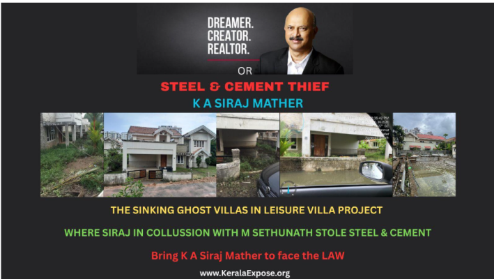 The Leisure Villa Scandal: In a shocking display of negligence and fraud of bad design and bad supervision (& theft of steel and cement), fourteen villas in the Leisure Villa project - overseen by Siraj and Mr. M. Sethunath (current CEO of CREDAI Kerala) - physically sank into the ground. These fourteen ghost structures remain uninhabitable even today. Owners of these fourteen villas are still waiting for rectification by Mather Projects, which the company has promised to rectify but has not been able to do due to limited cash flow from the consequences of Siraj’s embezzlement.