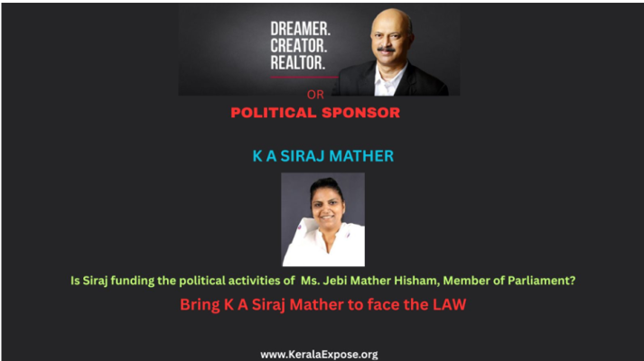 Using the Name of Another Mather Family Member: Our investigation reveals Siraj successfully used the name of Ms. Jebi Mather Hisham (paternal cousin), Member of Parliament and President, Kerala Pradesh Mahila Congress, to enhance his credibility and standing amongst investors and home buyers when the going became tough after one project after another of Siraj started collapsing. Sources close to Siraj reveal that he openly claimed to be the financier behind Jabi Mather Hisham’s political ascent from Aluva Block Youth Congress Committee to Kerala Pradesh Youth Congress Committee to Indian Youth Congress to Aluva Municipality to the Parliament of India and to Kerala Pradesh Mahila Congress.
