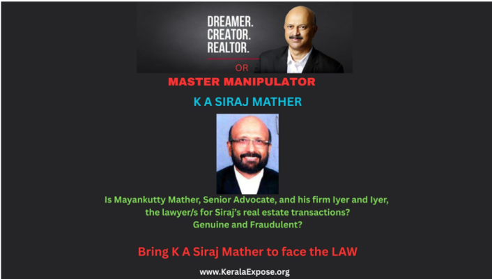 Our investigation reveals that Siraj successfully used the legal acumen of three Mather family members to save himself from difficult legal situations which could have put him in jail for long periods We have reason to believe from details shared with keralaExpose.org by previously close associates of Siraj that at least one from the three Mather family lawyers moved beyond legal counsel to become an active participant in Siraj’s criminal enterprise.