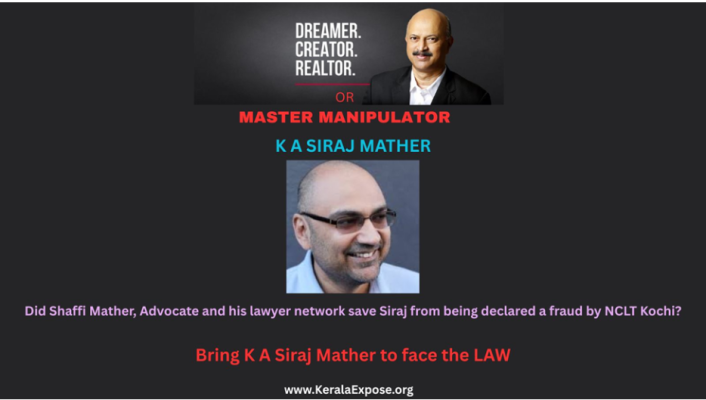 Advocate Shaffi Mather (The Saver): Despite being a vocal opponent of Siraj from the time Siraj’s diversion of funds and fraudulent activities were discovered in Mather Group by K M I Mather, Shaffi Mather (paternal cousin) was manipulated by Siraj to introduce high profile legal luminaries from his network in Mumbai and Bengaluru to Siraj to defend himself in NCLT Kochi. Siraj used intermediaries and the plea of the need to "protect his brother Raffi Mather" to get Shaffi Mather to introduce specialized high-profile corporate and insolvency lawyers from Mumbai and Bengaluru to him. These lawyers helped Siraj defend and fend off the allegations of fraudulent and preferential transactions raised by the Resolution Professionals against him in the NCLT Kochi.