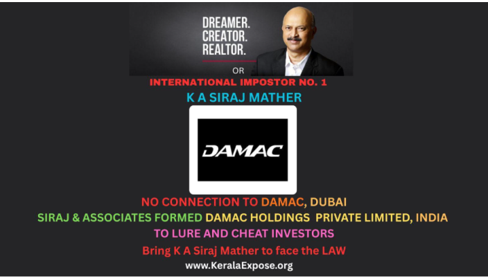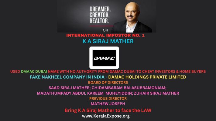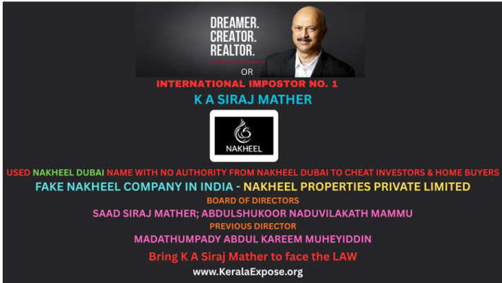 KERALAEXPOSE.ORG ACTION ALERT: KeralaExpose.org is writing to Dubai Police and Dubai Land RERA to investigate how Siraj and his associates - Abdulshukoor Naduvilkath Mammu, Kakanattil Siraj Mather Saad Mather, Madathumpady Abdul Kareem Muheyiddin, Chidambaram Balasubramoniam, Kakanattil Mohammed Zuhair Mather Siraj Mather and Mathew Joseph criminally misused the corporate name and brand name of NAKHEEL and DAMAC to lure innocent investors into their fraudulent real estate traps. Separately, KeralaExpose.org is writing to SFIO and Ministry of Corporate Affairs, Government of India to immediately investigate how Siraj and his associates misused the corporate name and brand name of NAKHEEL, Dubai, and DAMAC, Dubai, to lure investors into investing in their fraudulent real estate projects in India. KeralaExpose.org is writing to Income Tax Kerala, Income Tax India, CBDT, the Enforcement Directorate, and the Ministry of Finance to investigate how Siraj and his associates have used Nakheel Properties Private Limited and Damac Holdings Private Limited to launder money and to conceal his illicit wealth collected and cheated from investors, homebuyers, banks, and stakeholders.