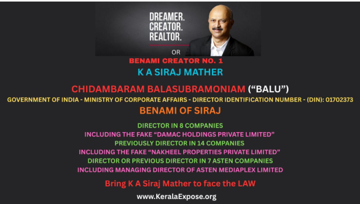 KeralaExpose.org investigations and sources previously close to Siraj confirm to us that Chidambaram Balasubramoniam or Balu (note the official email address of Damac Holdings Private Limited is balus5858@gmail.com) is one of the key benamis of Siraj and a holder of his benami companies and assets.