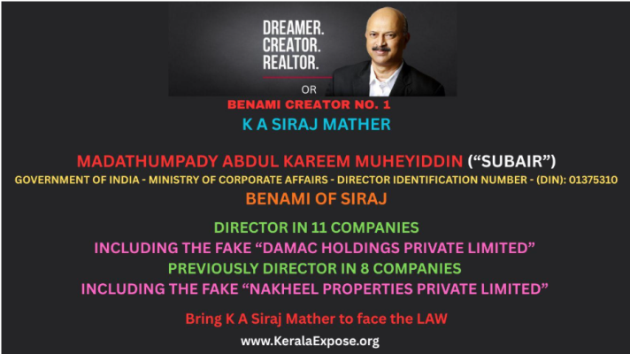 KeralaExpose.org investigations and sources previously close to Siraj also inform us that Madathumpady Abdul Kareem Muheyiddin or Subair is a Director in Damac Holdings Private Limited – the fake Damac Dubai company in India and was previously a Director in Nakheel Properties Private Limited - the fake Nakheel Dubai company in India, both setup by Siraj and his associates. Subair is also known in Siraj’s inner circle to be one of the key benamis of Siraj and a holder of his benami companies and assets.