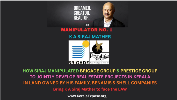 Pointer: Reliable sources have shared with KeralaExpose.org documents and email communications indicating that, prima facie, one deal points to Prestige entering into a joint venture development arrangement with Siraj and his siblings for an ancestral property Siraj jointly owns with his siblings. KeralaExpose.org is reviewing these documents and email communications. We have also been tipped off about other deals being discussed with both Brigade and Prestige to potentially develop the large benami land holdings Siraj possesses in the Greater Kochi area.