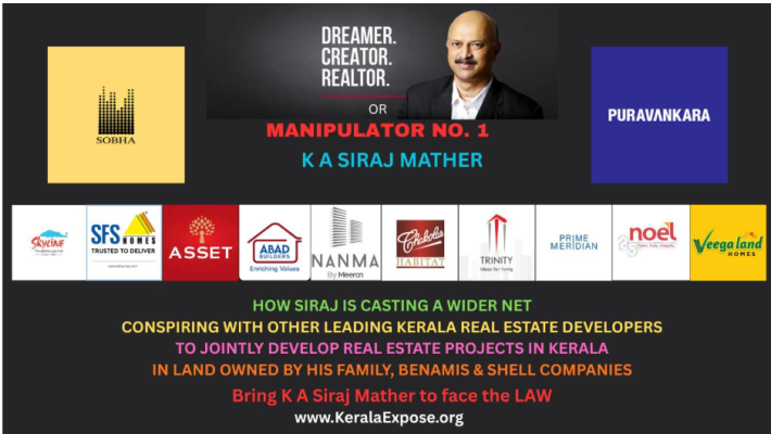 Separately, with funds flow choking fully to Siraj after the implosion of Asten Group and the Kerala real estate investment community and investors starting to recognizing his criminal wrongdoings and fraudulent activities, reliable sources inform us that Siraj is in active, clandestine discussions with the following leading Kerala real estate developers: