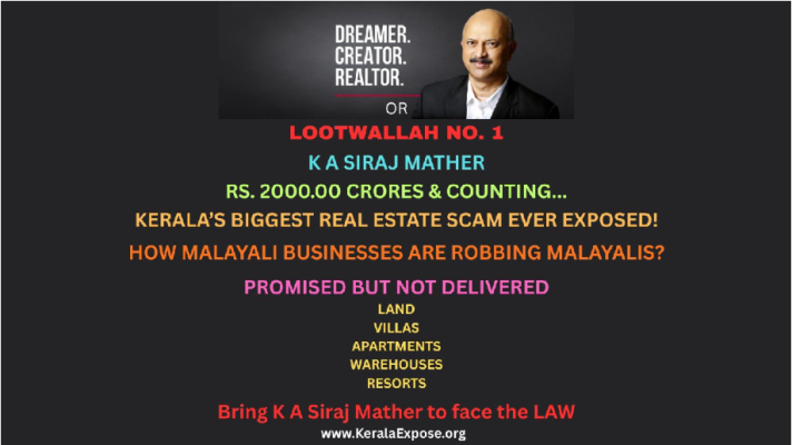 KeralaExpose.org’s relentless crusade is to bring to light the unprecedented ₹ 2,000 Crore real estate scam perpetrated by K.A. Siraj Mather in the state of Kerala. He has successfully kept this under the radar of authorities, media, and public using his influence, money power, and religious fundamentalist network.