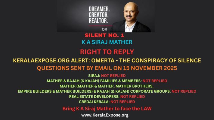 Upholding the platinum standard of investigative journalism, KeralaExpose.org emailed a list of questions to the individuals, families, companies, organisations and corporate groups named in this Investigative Report 1 by KeralaExpose.org on 15.11.2025 via email, offering them the opportunity to explain their respective stance on this Investigative Series exposing Kerala’s biggest ever real estate scam by K A Siraj Mather.