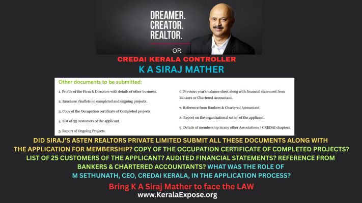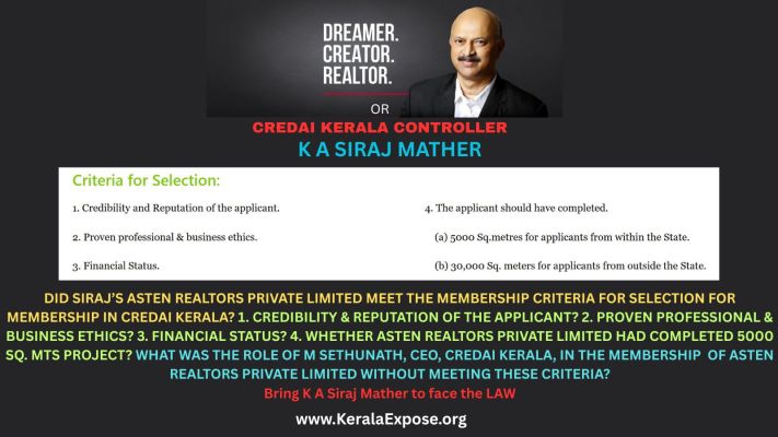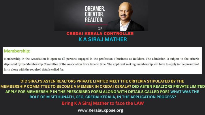 Imagine CREDAI KERALA being an arm of the Government? If membership were granted and continued by Government servants like how Siraj and Asten Realtors Private Limited enjoyed membership, its privileges, credibility and cover of CREDAI KERALA with impunity, those responsible would have been arrested and prosecuted for facilitating and supporting Kerala’s biggest scam ever.