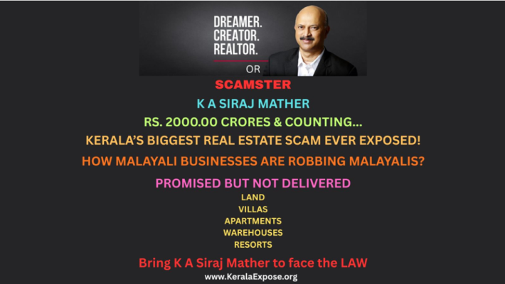 KeralaExpose.org continues our relentless effort to bring to light the unprecedented ₹ 2,000 Crore real estate scam perpetrated by K.A. Siraj Mather in the state of Kerala. He has successfully kept this under the radar of authorities, media, and public using his influence, money power, and religious fundamentalist network.