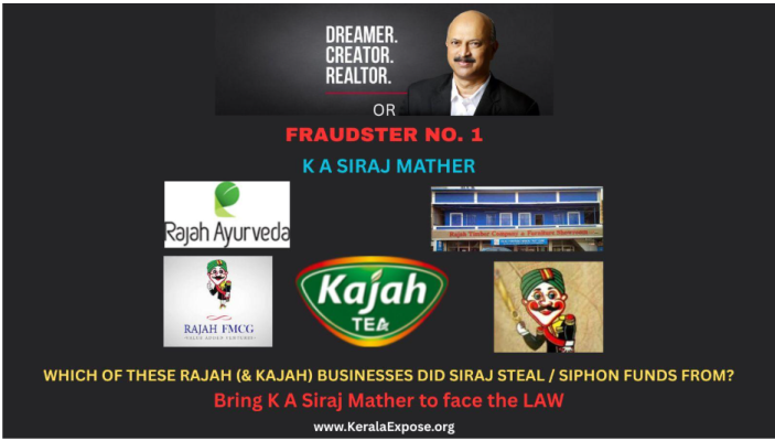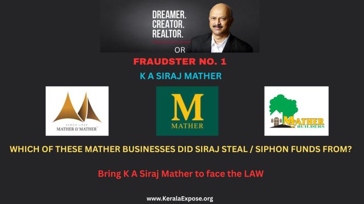 K A Siraj Mather, Kerala's Biggest Real Estate Scamster, was exposed and continue to be exposed of his criminal wrongdoings, fraudulent activities, money laundering operations and other illegal activities including anti-national activities through our Investigative Report 1 - Chapters 1-5. Chapter 6 of Investigative Report 1 is scheduled to be published next week wherein we will expose with official documents and judicial pronouncements how K A Siraj Mather raised loans and liabilities of ₹ 500.00 Crores+ which remains unpaid as of today. Further, he also has unpaid government dues to both Government of India and Government of Kerala of nearly ₹ 10.00 Crores which will also be established with official documentation and judicial pronouncements. K A Siraj Mather has cheated 2000+ investors / homebuyers of ₹ 2000.00 Crores+ since 2000. Yet, he remains free from any legal action from any authority including Kerala Police till date.
