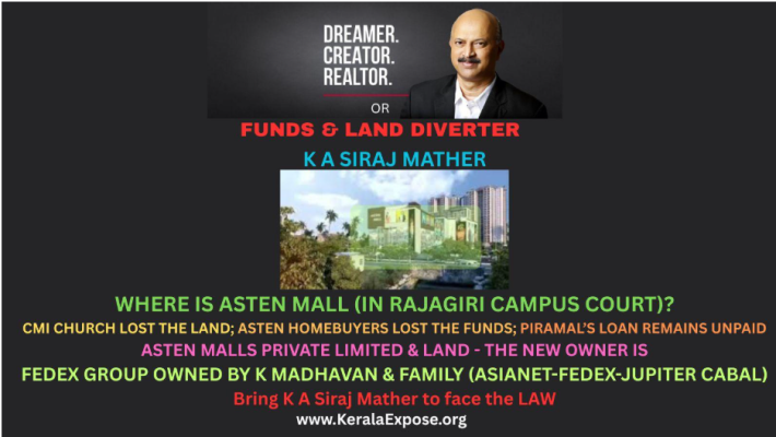 The Associates: In stark contrast, sources previously close to Siraj confirms to KeralaExpose.org that Fedex Group, Asianet, Jupiter Capital, and K Madhavan and his family were active participants who funded Siraj and thereafter profited from Siraj’s fraudulent empire, conspiring with Siraj to cheat legitimate stakeholders including investors and homebuyers in Asten Group, Piramal Capital & Housing Limited, CMI Church, suppliers, contractors, employees and other stakeholders.