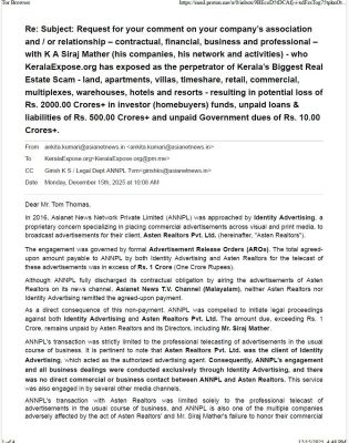 KERALAEXPOSE.ORG ALERT - OFFICIAL RESPONSE FROM ASIANXT DIGITAL TECHNOLOGIES PRIVATE LIMITED FOR AND ON BEHALF OF ASIANET NEWS NETWORK PRIVATE LIMITED: KeralaExpose.org wrote* to 8 Asianet Companies** seeking comments on their association and / or relationship with K A Siraj Mather. KeralaExpose.org has received a response from Asianxt Digital Technologies Private Limited clarifying Asianet News Network Private Limited’s relationship with K A Siraj Mather and Asten Realtors Private Limited. According to the response received from Asianxt Digital Technologies Private Limited: