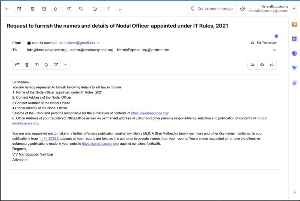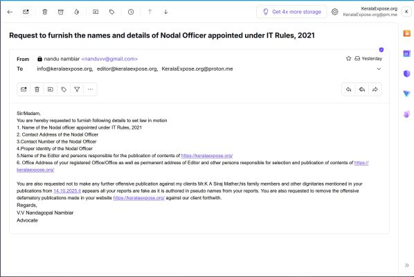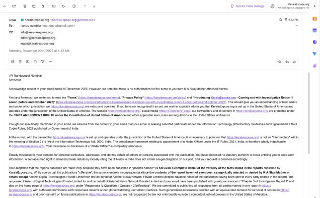 We have responded to Advocate V.V Nandagopal Nambiar to his email dated 16.12.2025. We have also followed the highest journalistic standards in watchdog journalism wherein we wrote to each and every individual with sufficient notice before their names were included in the reports we have published till date. However, even Advocate V.V Nandagopal Nambiar has made a sweeping allegation that the reports published in KertalaExpsoe.org are "fake" only because they have been published in "pseudo names"* when there is not even a complete denial of the veracity of the facts stated in the reports published by KeralaExpose.org. While Advocate V.V Nandagopal called the publications "offensive", the same is entirely inconsequential since the contents of the report have not even been categorically rejected or denied by K A Siraj Mather, the main protagonist in the report or others except Asianxt Digital Technologies Private Limited for and on behalf of Asianet News Network Private Limited (despite advance notice of the publication having been sent to every party named in the report). The response of Asianxt Digital Technologies Private Limited for and on behalf of Asianet News Network Private Limited and Advocate V.V Nandagopal Nambiar's email have been published with great prominence in "Chapter 5 of Investigative Report 1" on the home page of https://keralaexpose.org/ under "Responses to Questions / Queries / Clarifications" and in our social media accounts. Similarly, we are committed to publishing all responses from all parties named in any report in https://keralaexpose.org/ with sufficient prominence such responses deserve under global watchdog journalistic practices. Such generalized accusations by one Advocate V.V Nandagopal Nambiar coupled with an open-ended demand for removal of content in https://keralaexpose.org/ and prior restraint on future publications in https://keralaexpose.org/, are not recognized by law nor enforceable outside a competent judicial process in the United States of America. As per our legal counsels in India, such demands are not recognized by law in India nor enforceable outside a competent judicial process in India. We will be publishing the legal notice issued by Advocate V.V Nandagopal Nambiar dated 19.12.2025 and this email from the Legal team of KeralaExpose.org to Kerala Police also on KeralaExpose.org and our social media accounts.