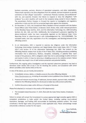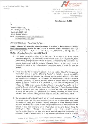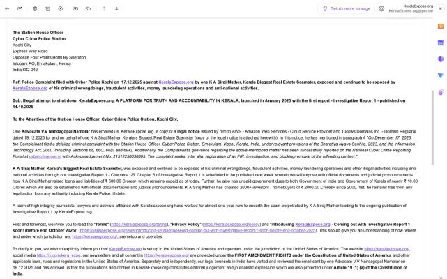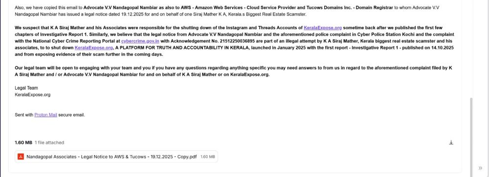 One Advocate V.V Nandagopal Nambiar has emailed us, KeralaExpose.org, a copy of a legal notice issued by him to AWS - Amazon Web Services - Cloud Service Provider and Tucows Domains Inc. - Domain Registrar dated 19.12.2025 for and on behalf of one K A Siraj Mather, Kerala.s Biggest Real Estate Scamster (copy of the legal notice is attached herewith). In this notice, he has mentioned in paragraph 4 "On December 17, 2025, the Complainant filed a detailed criminal complaint with the Station House Officer, Cyber Police Station, Ernakulam, Kochi, Kerala, India, under relevant provisions of the Bharatiya Nyaya Sanhita, 2023, and the Information Technology Act, 2000 (including Sections 66, 66C, 66D, and 69A). Additionally, the Complainant's grievance regarding the above-mentioned matter has been successfully reported on the National Cyber Crime Reporting Portal at cybercrime.gov.in with Acknowledgement No. 21512250036895. The complaint seeks, inter alia, registration of an FIR, investigation, and blocking/removal of the offending content."