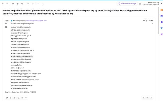 Ref: Police Complaint filed with Cyber Police Kochi on 17.12.2025 against KeralaExpose.org by one K A Siraj Mather, Kerala Biggest Real Estate Scamster, exposed and continue to be exposed by KeralaExpose.org of his criminal wrongdoings, fraudulent activities, money laundering operations and anti-national activities.