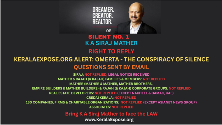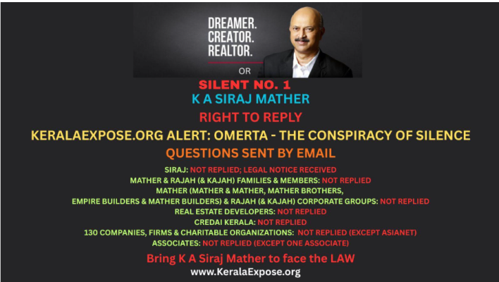 The silence of K A Siraj Mather is deafening and self-incriminating. The silence of the Mather and Rajah (& Kajah) families, the Mather and Rajah (& Kajah) family members (to whom KeralaExpose.org had raised individual questions) and the two corporate groups - Mather Group (Mather, Mather & Mather, Mather Brothers, Empire Builders, and Mather Builders) and Rajah (& Kajah) Group are intriguing to say the least raising questions about their role in Siraj’s criminal wrongdoings and fraudulent activities. The collective silence of CREDAI KERALA and the Indian & Kerala Real Estate fraternity to whom KeralaExpose.org had raised important questions of complicity with Siraj in his criminal wrongdoings and fraudulent activities clearly points unmistakably to a deep-seated, complicit, and illegitimate nexus they may have with K A Siraj Mather and his nefarious dealings. Asianet News Group also sent a response which has also been published prominently by KeralaExpose.org. The silence of K Madhavan and his companies are also perplexing to say the least considering that he has been the leader of one of the most prominent media groups in India and Kerala specifically.